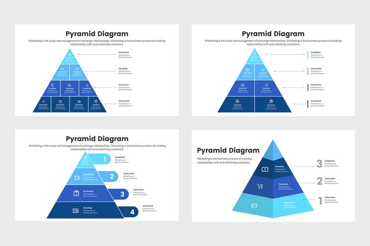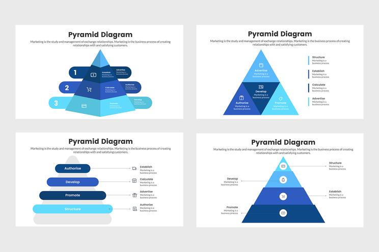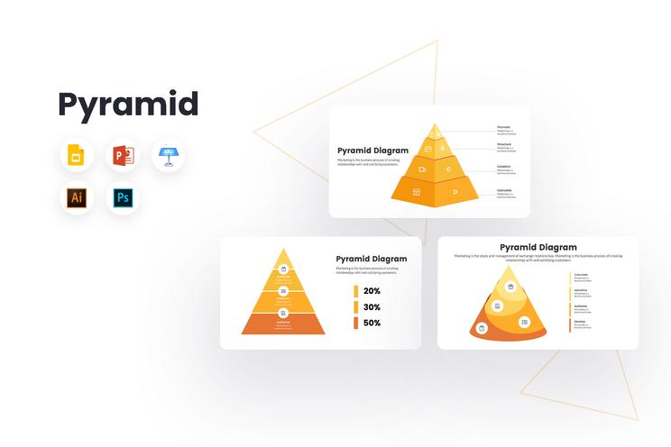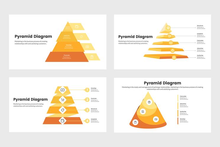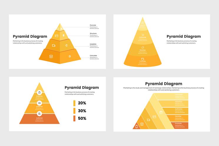 Pyramid Infographics là một cách hấp dẫn, có nhiều thông tin để trình bày theo thứ tự phân cấp. Nó giúp người dùng trình bày dữ liệu và ý tưởng của họ một cách có hệ thống bằng cách cho phép họ tạo ra các kim tự tháp với mức độ quan trọng của thông tin. Bạn cũng có thể đặt các con số gần mỗi mục tiêu ở cấp hiện tại trong danh mục đó để đối tượng của bạn có bối cảnh như bạn đang sử dụng để đặt các mục trong cấp hoặc danh mục phụ.