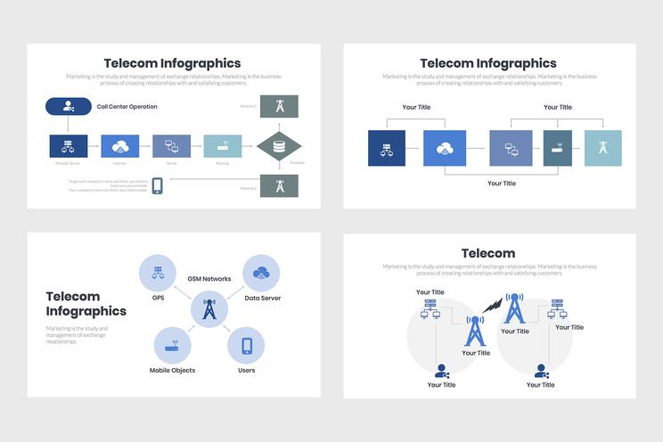 Telecom Infographics là một tập hợp các đồ họa thông tin mà bạn có thể chia nhỏ sự tương tác giữa những người tham gia truyền thông và triển khai công nghệ. Telecom Infographics sẽ giúp bạn hiểu cách hoạt động của thiết bị điện tử trong cuộc sống hàng ngày của chúng ta để cải thiện các cuộc họp của bạn.