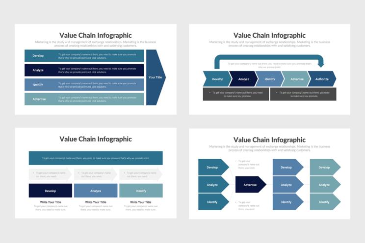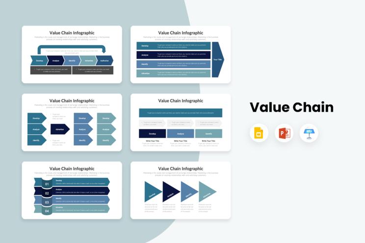 Tạo chiến lược cho tổ chức với đầu vào là các ý tưởng của bạn và của đồng nghiệp được thể hiện bằng Value Chain Infographics. Tạo một đề mục rõ ràng cho mọi thứ, từ tìm nguồn cung ứng vật liệu đến trách nhiệm giải trình. Bạn sẽ thấy rằng điều này sẽ làm giảm thông tin sai lệch, tăng tính minh bạch và tính hiệu quả.