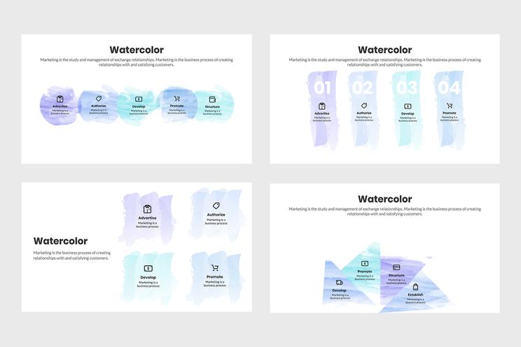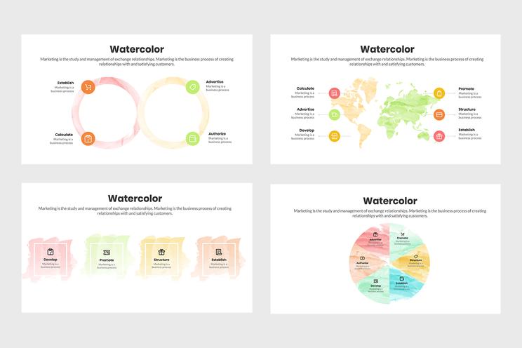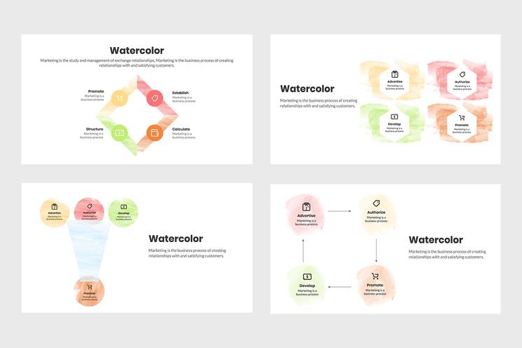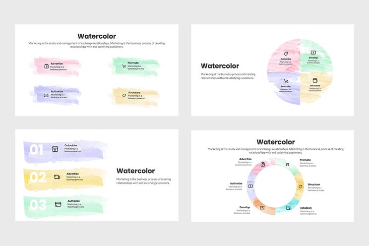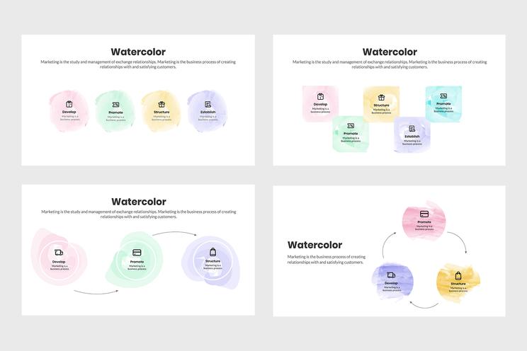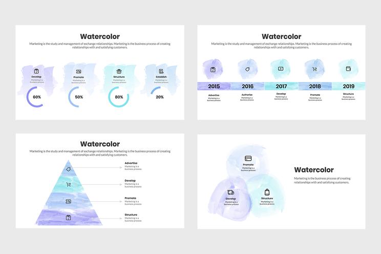Watercolor Infographics giúp mang lại cho bạn sự sáng tạo trong phần trình bày. Từ các khái niệm đến thông tin chiến lược, những đồ họa về thông tin này sẽ cho phép bạn trình bày một thứ gì đó một cách mới mẻ và giúp khán giả của bạn được giải trí và được cung cấp thông tin. Với nhiều tùy chọn khác nhau, bất kỳ loại thông điệp nào cũng có thể được truyền tải một cách rõ ràng và hiệu quả theo cách thiết kế trực quan phù hợp với màu sắc của thương hiệu, cái mà nổi bật trên trang bằng màu nước, có độ phân giải cao mà không hề ảnh hưởng đến khả năng đọc hiểu.